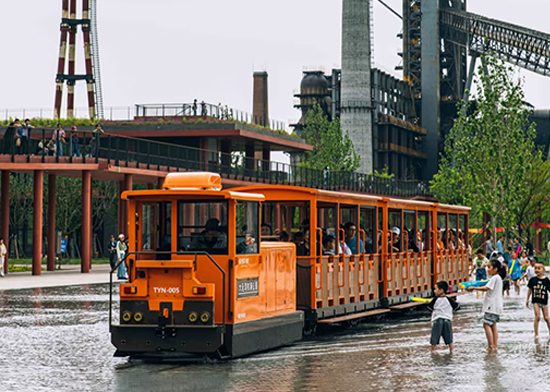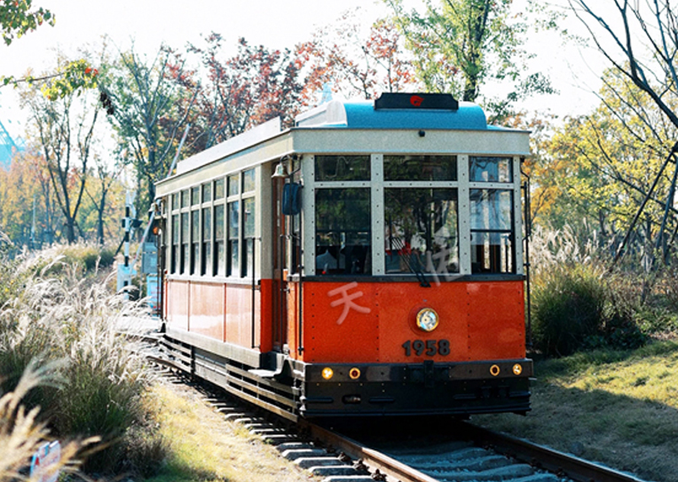 在杭钢公园历史遗存的轨道上,行驶着一辆充满复古年代感的铛铛车